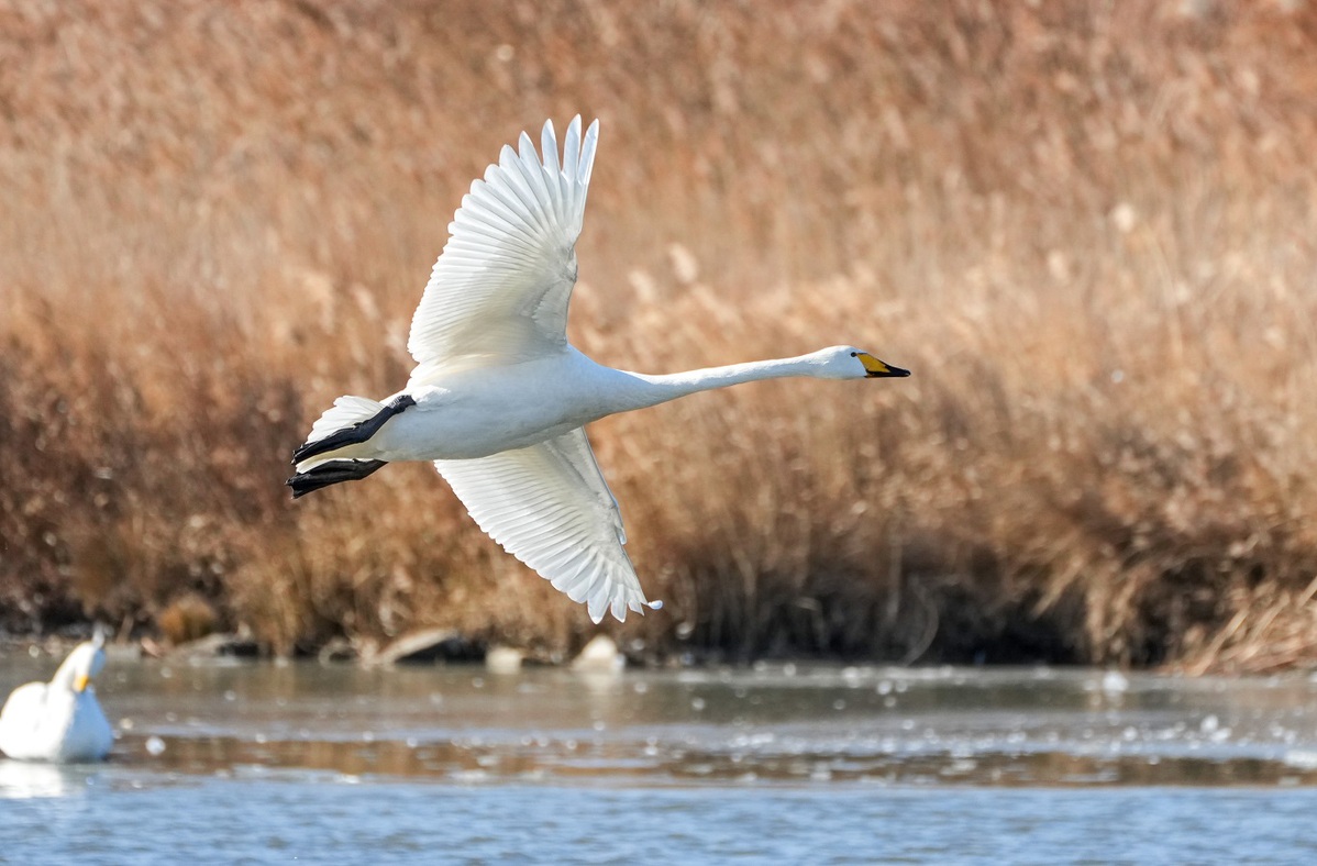 A wintering whooper swan flies at a national nature reserve in Rongcheng, East China's Shandong province, Jan 5, 2026. [Photo/Xinhua]