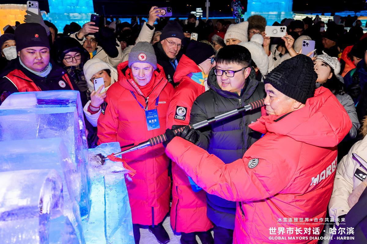 Representatives of the Global Mayors Dialogue · Harbin carve an ice block on Tuesday at the Ice and Snow World in Harbin, Heilongjiang province. [Photo provided to chinadaily.com.cn]