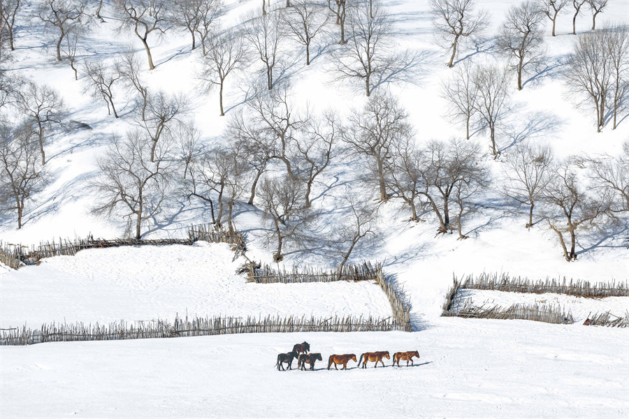 The photo captures horses walking across a snow-covered field. [Photo by Zhao Yongsheng/cpanet.org.cn]