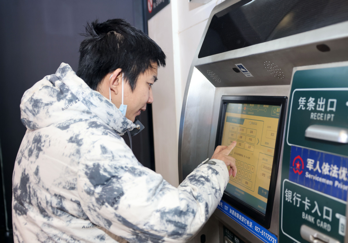 A passenger purchases train ticket at a railway station in Wuhan, Central China's Hubei province, Jan 19, 2026. [Photo/Xinhua]