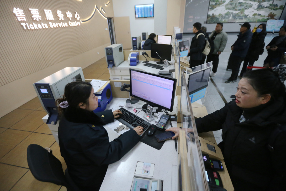 Passengers purchase train tickets at a railway station in Yangzhou, East China's Jiangsu province, Jan 19, 2026. [Photo/Xinhua]