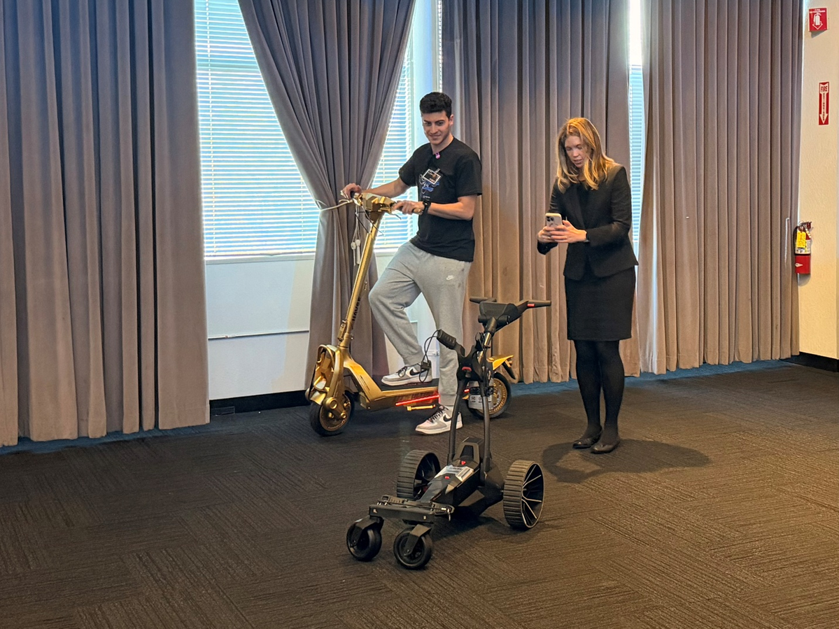 "A hand gesture tells it to start following, or you can use your voice to start or stop, totally hands-free," he said. "This cart is designed to be compact, weighing only 33 pounds, including the battery."