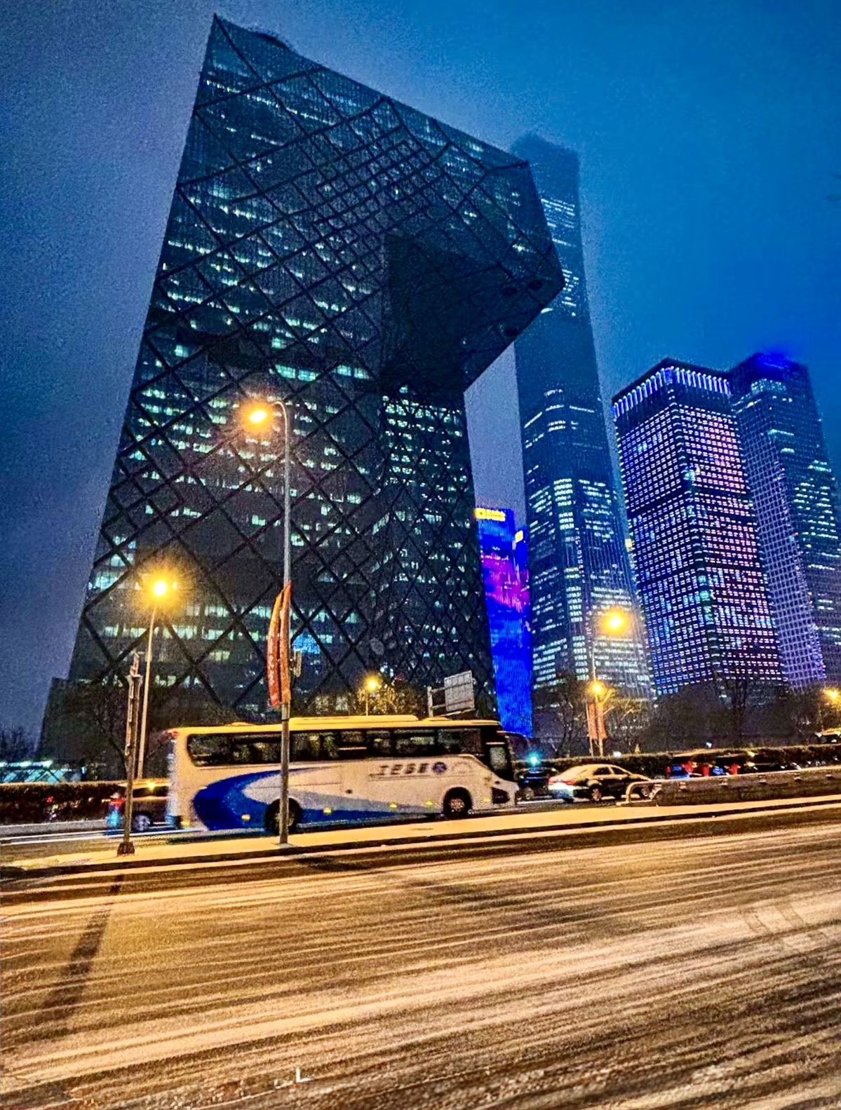Snow on East No 3 Ring Road with CCTV HQ and CBD [Photo by Bruce Connolly/chinadaily.com.cn]