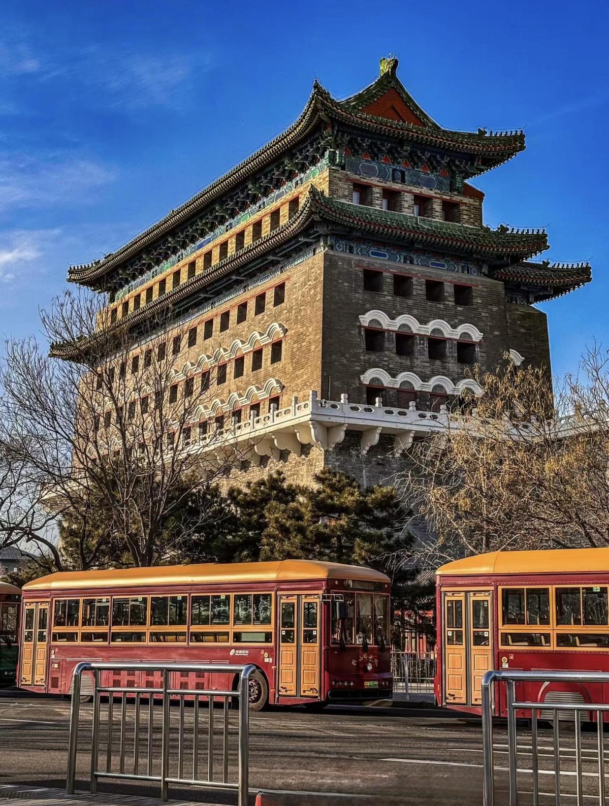 Qianmen - Jianlou Tower and tour buses [Photo by Bruce Connolly/chinadaily.com.cn]