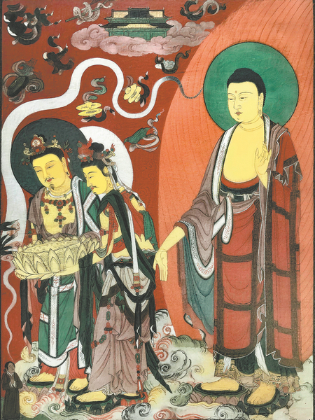 Among them, the 12th-century Water-Moon Guanyin maintains the elegant linear tradition of Central Plains Buddhist art, while incorporating the distinctive clothing patterns of Xixia patrons; the 13th-century Amitabha Buddha Welcoming Scene adopts classic Chinese composition but is brought to life with the intense blues, reds and golds favored in Central Asian art.